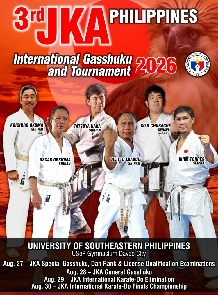 April 16, 2026 Davao City, Philippines — The Japan Karate Association Philippines proudly announces the staging of the 3rd JKA Philippines International Gasshuku and Tournament 2026, taking place on August 27–30, 2026, at the University of Southeastern Philippines Gymnasium.