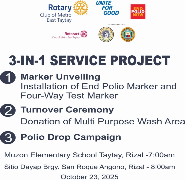 In observance of World Polio Day on October 24, the Rotary Club of Metro East Taytay (RCMET) and the Rotaract Club of Metro East Taytay (RACMET) came together for a meaningful cause — to help end polio and promote a healthier community for children and families.