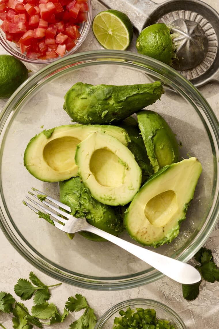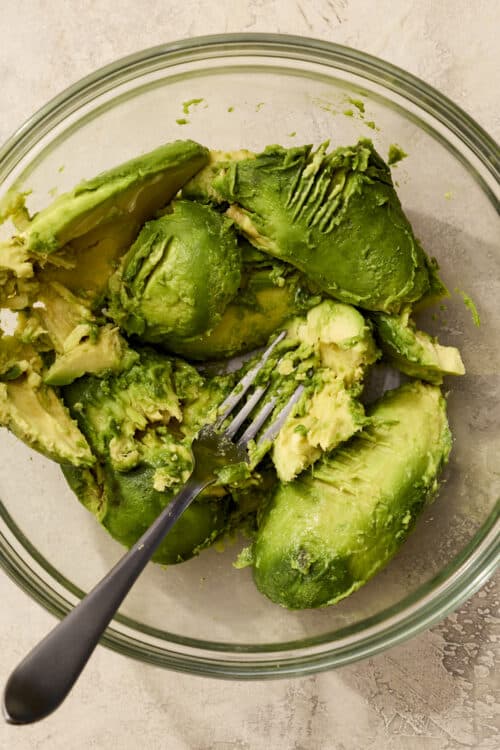 - Using a fork, gently mash the avocados, leaving some large chunks – make it as chunky or as smooth as desired
