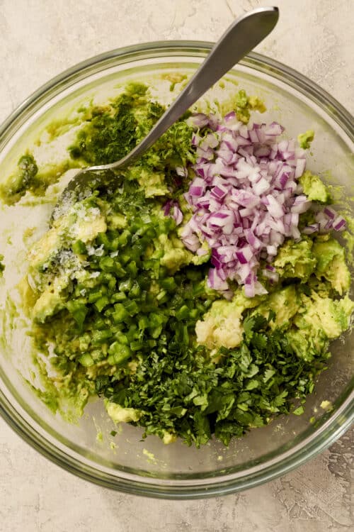 - Fold in onion, cilantro, lime zest + juice, jalapeño and garlic