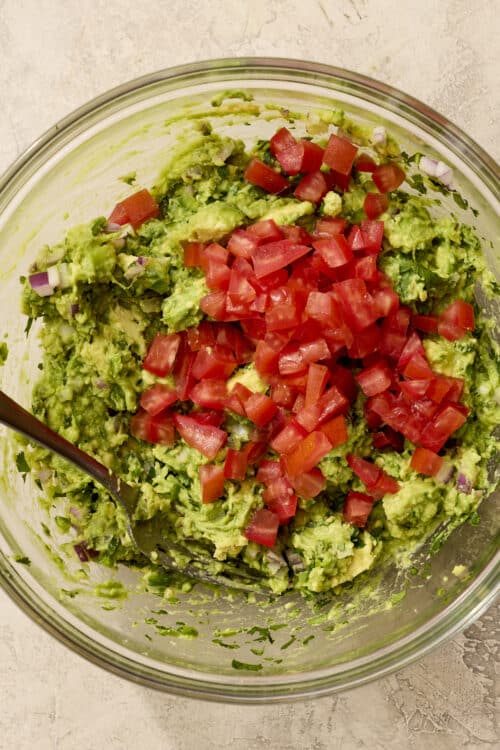This is purely based on personal preference, although purists are fully against adding tomatoes to guacamole, arguing that it adds excess moisture and can serve as a filler. But we love incorporating tomatoes for its fresh, bright flavors, adding a nice bite and yielding a chunkier guacamole dip.
