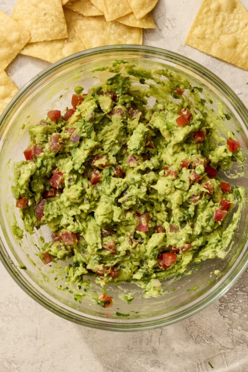 - Avoid overmixing. The ideal consistency for guacamole is slightly chunky – always gently fold the ingredients using a rubber spatula until just combined.